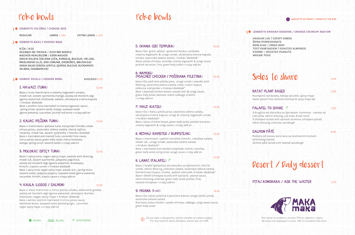 Welcome to MakaMaka Acai & Poke Bar Old Town, a delightful culinary gem nestled in the heart of Split, Croatia. Located on Ul. bana Josipa Jelacica 19, this vibrant eatery specializes in fresh poke bowls and nourishing acai creations. Patrons rave about the quality of ingredients, with highlights including the crispy chicken katsu "Maui" and refreshing lemonade, all embraced within a cool, inviting atmosphere. The friendly service and quick turnaround make it a perfect lunch spot for those exploring the city. Dive into a healthy dining experience where every bite bursts with flavor and freshness.